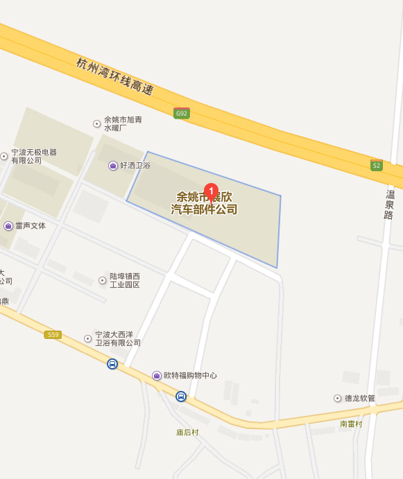 余姚市展欣汽車部件有限公司,地處寧(波)紹(興)平原中心,位于風景秀麗的浙江省余姚市陸埠鎮西工業園區。緊靠杭甬高速和蕭甬鐵路,近臨杭州灣跨海大橋,距河姆渡遺址10公里,距寧波櫟社國際機場40公里,距杭州蕭山國際機場80公里,交通便捷。